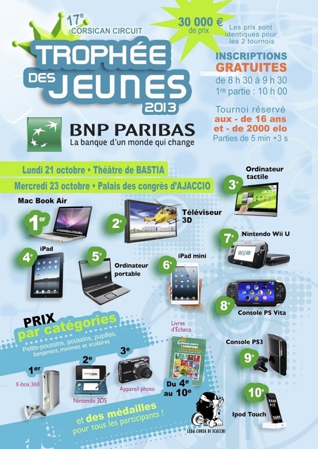 Sans oublier les traditionnels trophées des jeunes BNP Paribas à Bastia et Aiacciu dotés de 30 000 € de prix en nature et le tournoi de Blitz (5 000 €)