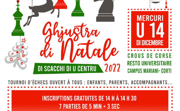 Un beau rendez-vous... Mercredi 14 décembre, à Corti, l' associu I Scacchi di U Centru fête Noël avec un joli tournoi de blitz gratuit doté de belles coupes et médailles ... Ghjustra di Natale di i...