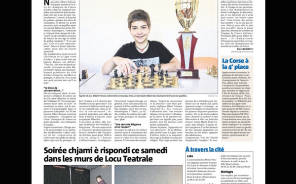 Le jeune champion et sa dynamique maman, par ailleurs présidente de l'Echecs Club Ajaccien, sont interviewés par le quotidien. Hier la Une était consacrée au Match Naiditsch-Najer, avant hier au...