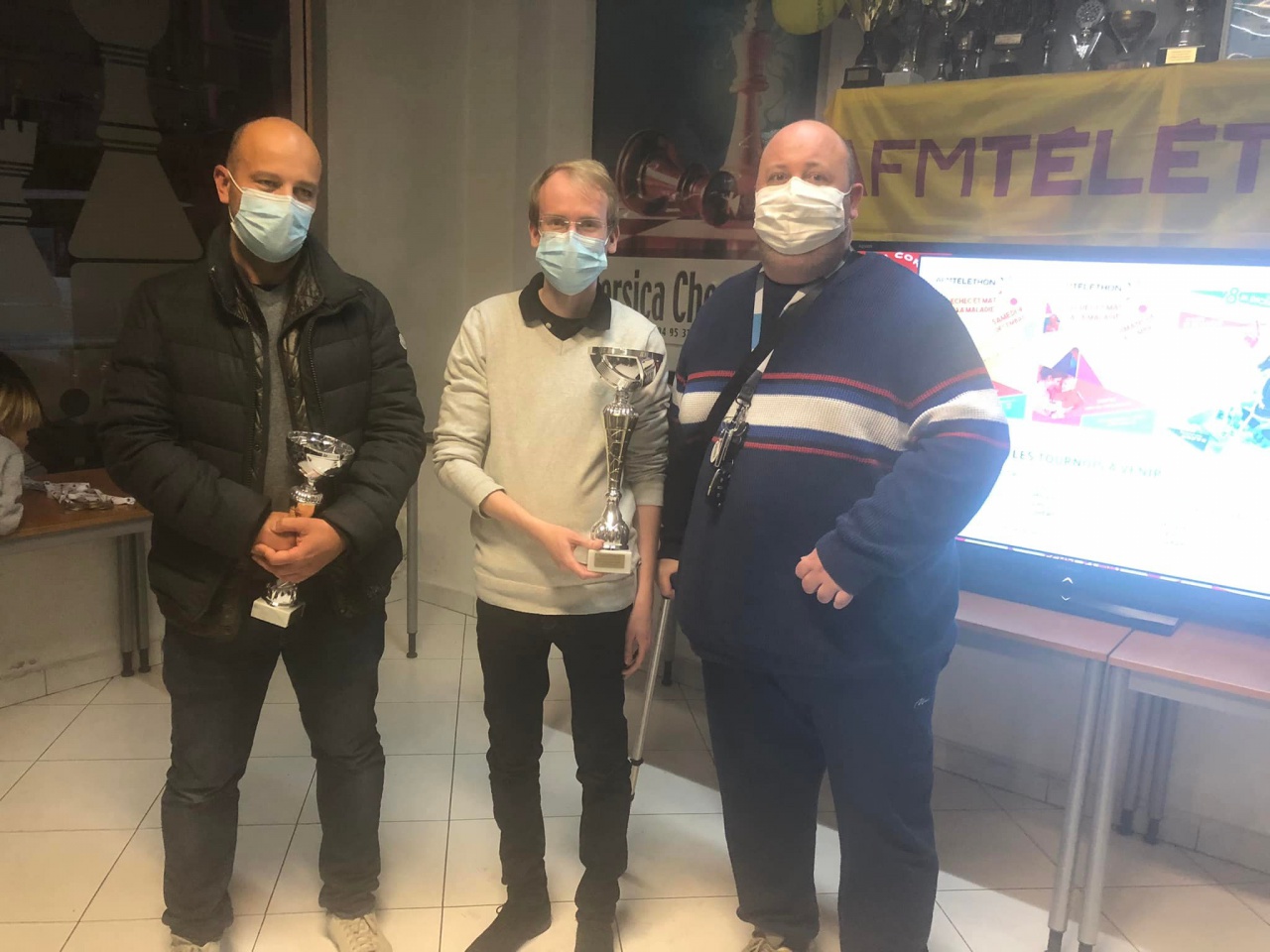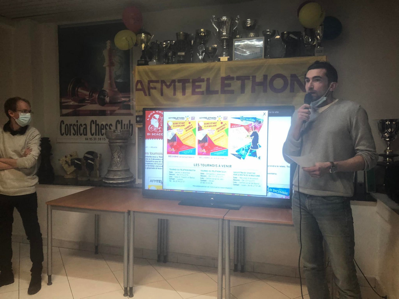 Une participation satisfaisante ( 61participants) compte tenu de la situation sanitaire actuelle. La cadence du tournoi était de 5mn + 3s et le nombre de rondes disputées 7. Bravo à Jean-Thomas Geronimi qui remporte le tournoi devant Apollo Deladerriere et Marc'Andria Battesti. Félicitation à tous les jeunes joueurs qui ont reçus coupes et médailles. Cinq cents euros de dons et d'inscriptions ont été collectés en faveur du Téléthon. Au nom de l'Association Française contre les Myopathies, le Corsica Chess Club remercie tous les participants et donateurs.