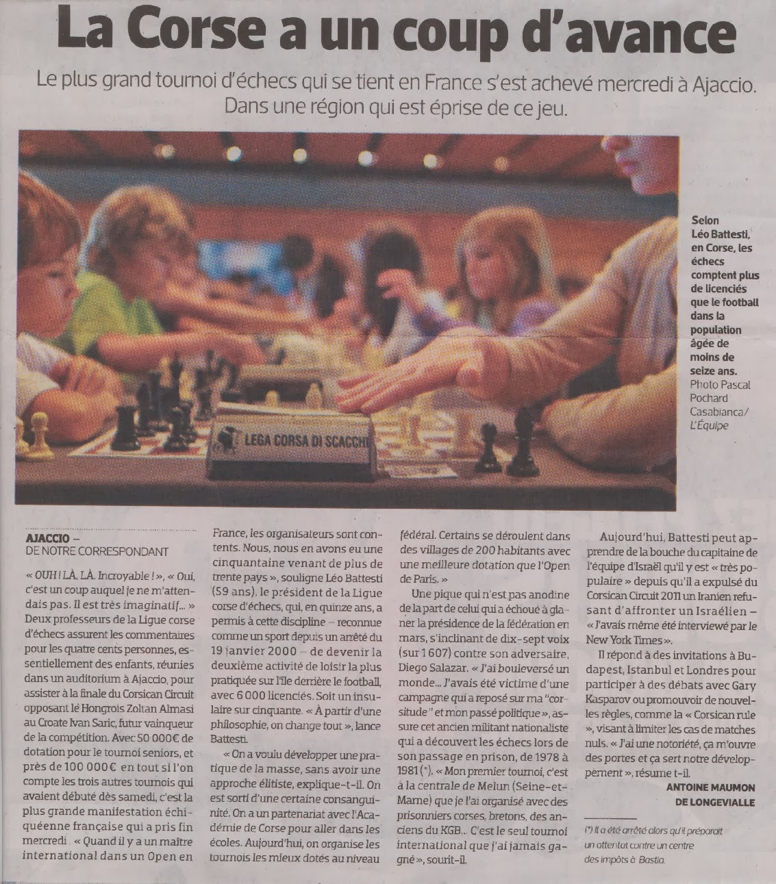 Du jamais vu pour le sport Échecs, le quotidien l’Équipe titre "La Corse, un coup d'avance" un article consacré au Corsican Circuit et au développement des Échecs dans l'île.