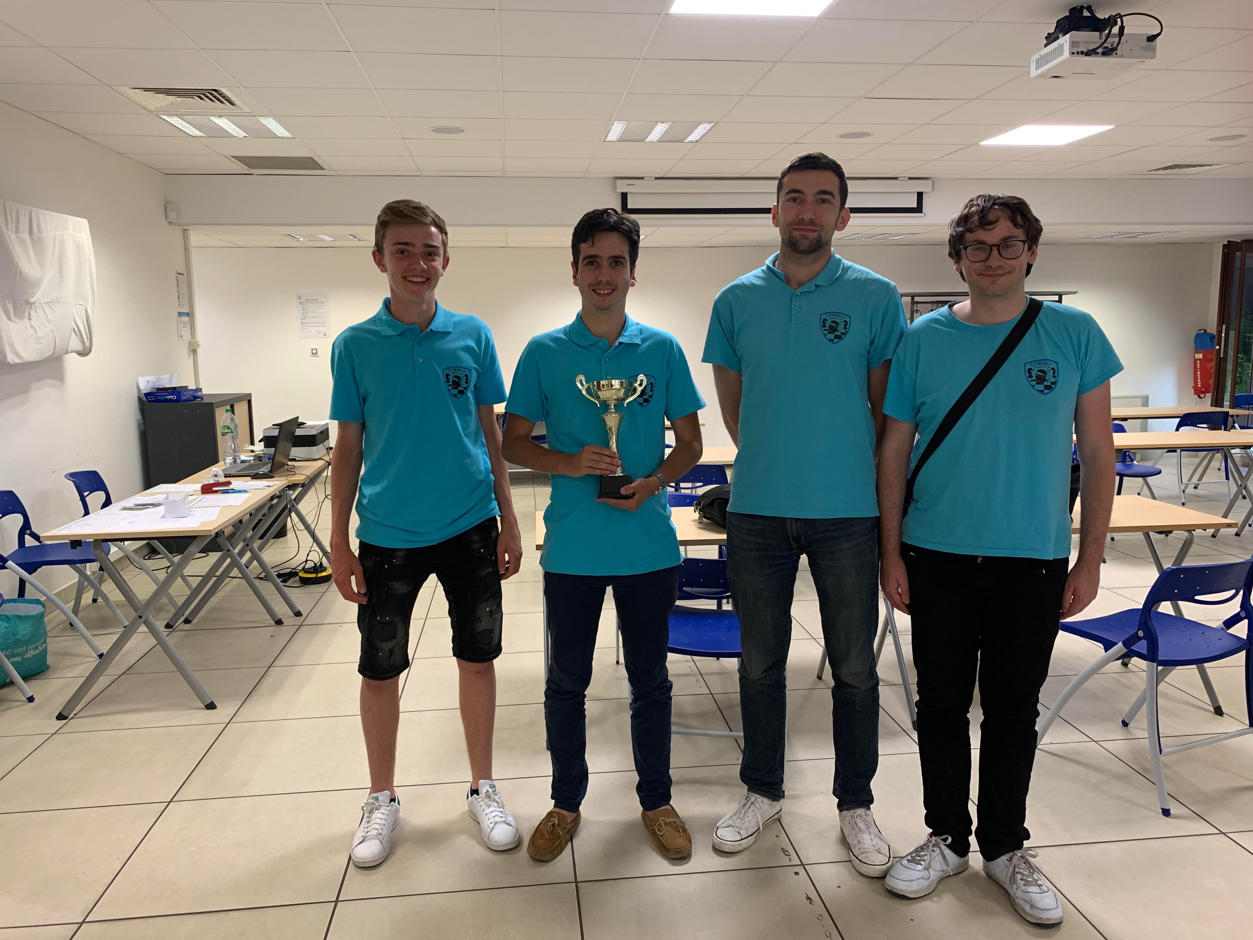Face à de redoutables adversaires du sud-est (Aubagne, Sanary-sur-Mer, Hyères), c’est le Corsica Chess Club (Ludovic UTRERA, Jean-Michel BIGONNET, Julien MORISON, Pierre-Ange DON IGNAZI) qui est ressorti vainqueur de cette journée avec 10 points sur 12 possible devant la tour Hyèroise. Malgré de belles performances, l’Échecs Club Ajaccien (Lisandru SIMEONI, Patrick SOETEWEY, Xavier CAROLAGGI, Florian BLAZIN) finit à la 4e place. Merci au club de Sanary-sur-Mer pour l’accueil et un grand merci à Corsica Ferries de nous avoir permis de nous déplacer.