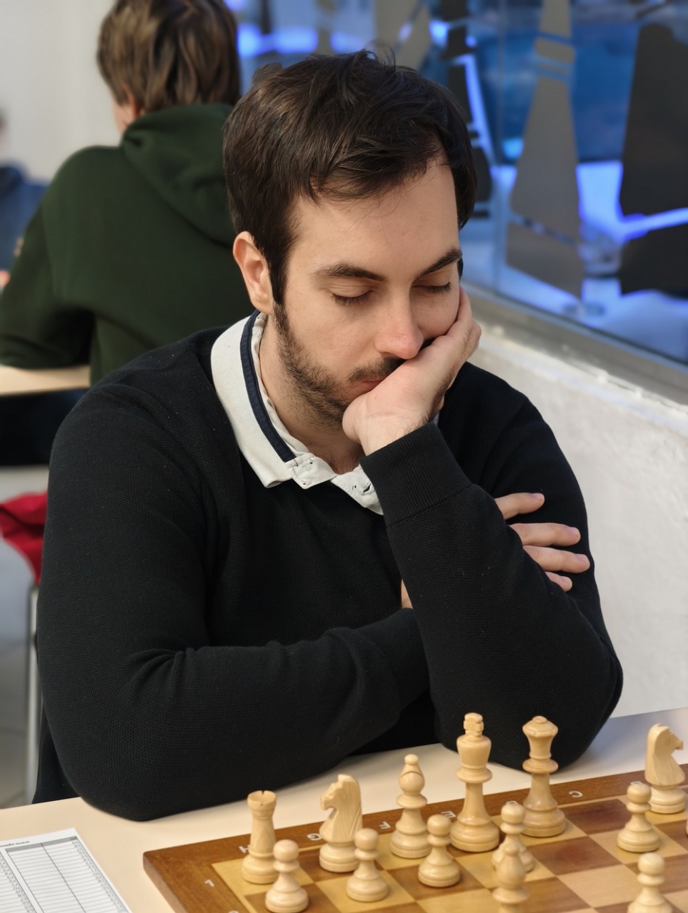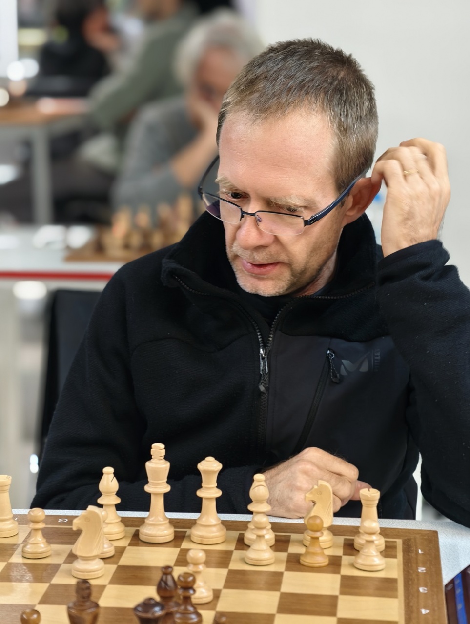 Lors de la ronde 5, les confrontations directes entre prétendants ont livré des enseignements importants. À l’échiquier 1, Matteo Ratier Fontana et Serge Guillemart se sont neutralisés, un résultat logique au terme d’une partie équilibrée, qui permettait aux deux joueurs de rester aux avant-postes. Dans le même temps, Hélio Deladerrière poursuivait son excellent tournoi en s’imposant face à Niculai Todirascu, confirmant sa régularité au plus haut niveau.