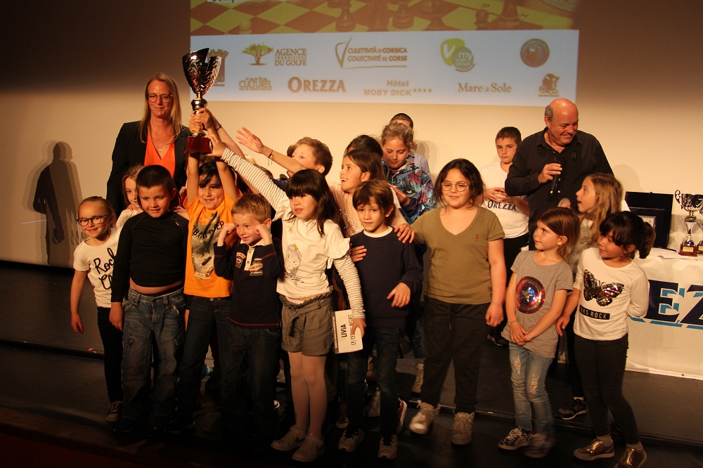 Chez les petits CE1/CE2, victoire de l'entente Livia Mme Megret / Zonza Mme Laudet 4,5/5 pts devant la classe de Portivechju Ce1/Ce2 de Mme Murra avec 3, 5 pts sur 5 parties et la classe de Portivechju Ce1 de Mme Silla 3/5 pts