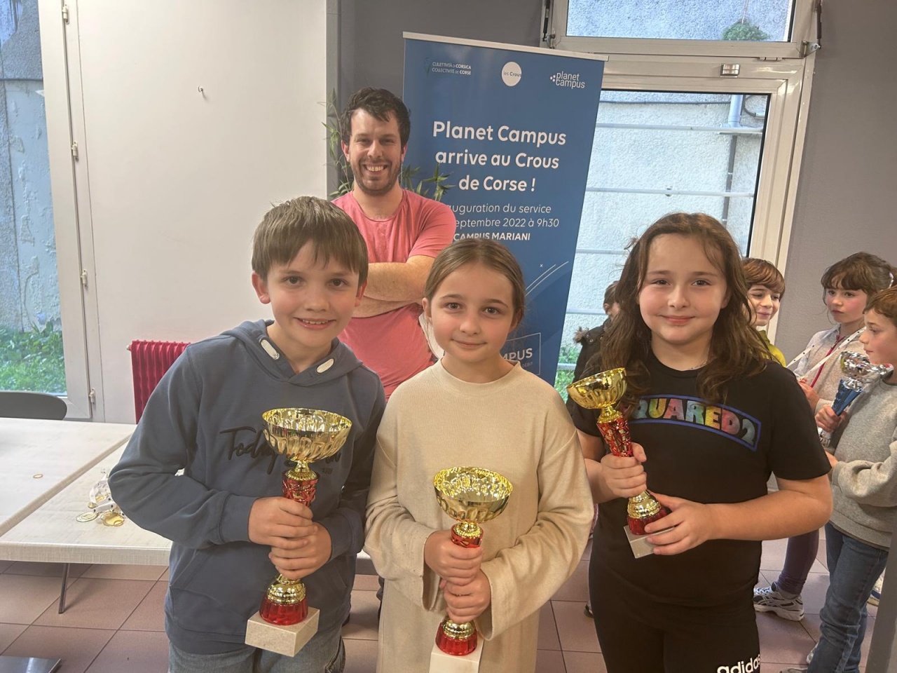 Dans la catégorie des moins de 10 ans, 3 joueurs finissent ex-aequo avec 5/6 points. Au départage, Carlu Maria Moracchini devance Ghjacumu Petru Tomasi et Lelia Cesari.