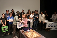 Et c'est sous l'ovation de parents et joueurs que Léo Battesti et Michel Barat ont ensuite signé le renouvellement de la convention triennale permettant, en particulier, l'enseignement dans le temps scolaire ! Tout un symbole. Les applaudissements furent aussi nourris pour accueillir la N°1 mondiale, Hou Yifan. Une présence très sympathique, car ayant perdu en 1/8e de finales, la championne chinoise a tenu à soutenir les organisateurs en se rendant à Aiacciu. Elle va même jusqu'à défier, avec sa mère, le président de la Ligue et Henri Dhery dans un blitz par équipe ! Finalement l'équipe BNP-Paris/Lega corsa a battu la Chine à la surprise générale ! Il est vrai qu'Henri Dehry est un grand spécialiste du Blitz !