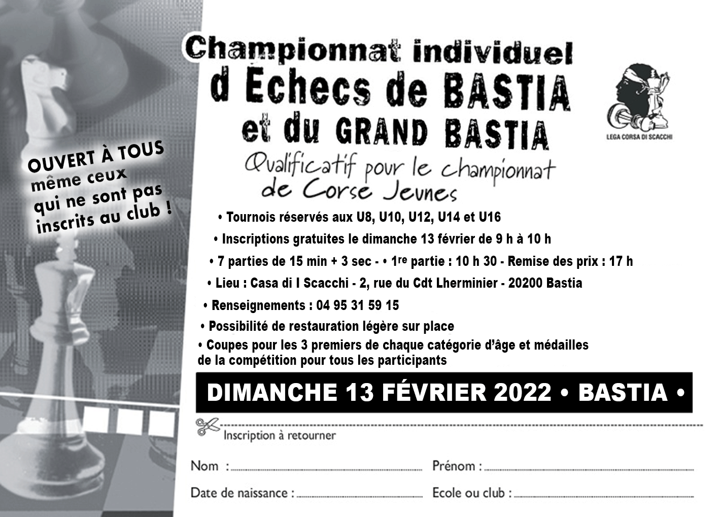 2, rue Commandant Lherminier 20200 Bastia Tel. : 04 95 31 59 15 E-mail : corse-echecs@orange.fr |
